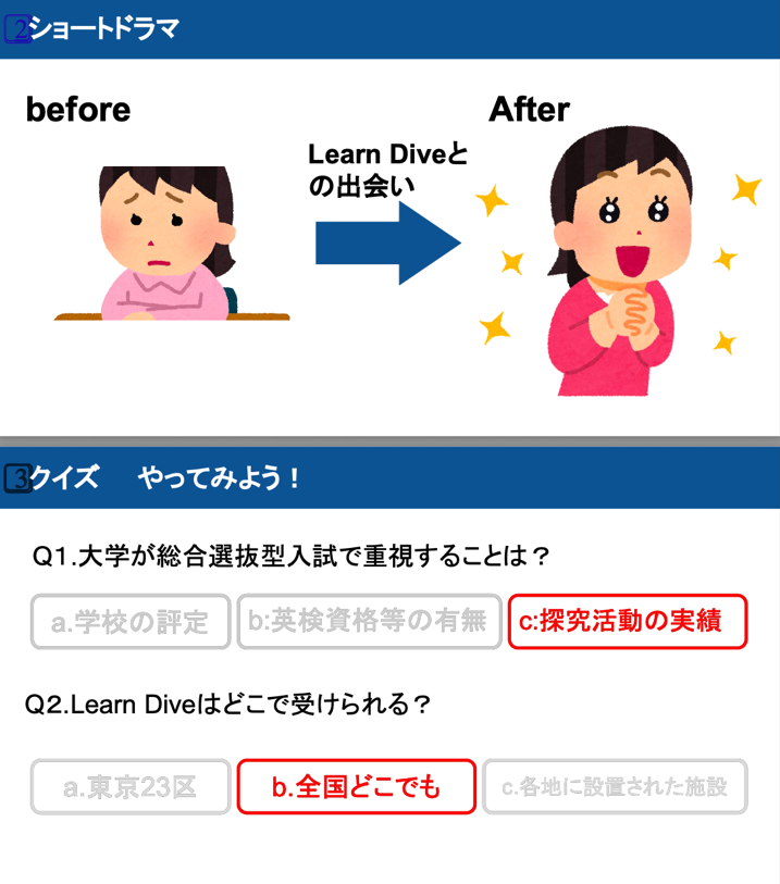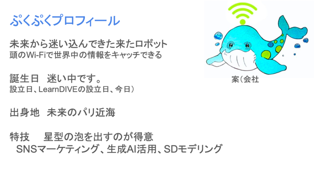 1班は、Learn DIVEの第一印象=コーポレートサイト体験に着目。高校生の視点から、親しみやすさと近未来感を兼ね備えたマスコットキャラクター「ぷくぷく」を提案しました。キャラクターは、Webサイトでの解説役、SNSアイコンなど、多用途展開を想定。単なる「かわいい案」に留まらず、ブランド体験全体を設計する視点が印象的でした。ロゴ版も用意してくれました。このロゴは早速Learn DIVEの新ロゴとして採用が決定しています。